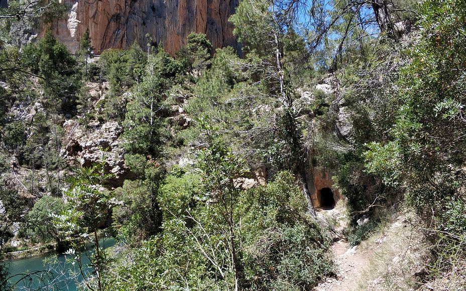 Luego, el camino se va estrechando conforme se acerca al río. Debido a la mayor humedad, hay un cambio en la vegetación. Enseguida estamos en la Presa de Cirat. Aunque es más conocida como la Presa de Los Estrechos. Debemos pasar por una puerta metálica. A esta presa bajan unas escaleras desde la carretera CV-20, un poco antes de la entrada al túnel. Desde aquí, las vistas del Estrecho de Chillapájaros son espectaculares.